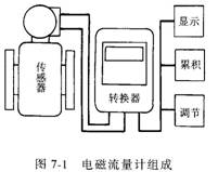 在結構上,電磁流量計由電磁流量傳感器和轉換器兩部分組成,如圖7-1所示。傳感器安裝在工業(yè)過(guò)程管道上,它的作用是將流進(jìn)管道內的液體體積流量值線(xiàn)性地變換成感生電勢信號,并通過(guò)傳輸線(xiàn)將此信號送到轉換器。轉換器安裝在離傳感器不太遠的地方,它將傳感器送來(lái)的流量信號進(jìn)行放大,并轉換成與流量信號成正比的標準電信號輸出,以進(jìn)行顯示,累積和調節控制。