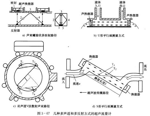 采用多聲道化和聲速多反射化方法進(jìn)行超聲流量測量方法示意圖