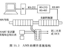(1) AMS的硬件結構 AMS的硬件系統結構如圖10.3所示,它由HART轉換器、 RS-232/RS-485通信轉換器、HART調制解調器和PC機組成。