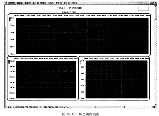 ③歷史曲線(xiàn)畫(huà)面。點(diǎn)擊標題欄中的"歷史曲線(xiàn)"按鈕就可彈出關(guān)于歷史曲線(xiàn)的對話(huà)框,在對話(huà)框中選擇變量名和日期,確認后就顯示相應檢測點(diǎn)的歷史曲線(xiàn)。點(diǎn)擊畫(huà)面中的"前一天"和"后一天"按鈕,就可實(shí)現翻頁(yè)。畫(huà)面中的縱坐標是自動(dòng)生成的,當某變量相對于標尺上限的相對值較小時(shí),可自動(dòng)改變標尺,使畫(huà)面得以展開(kāi),以便清晰讀數,如圖10.16所示。