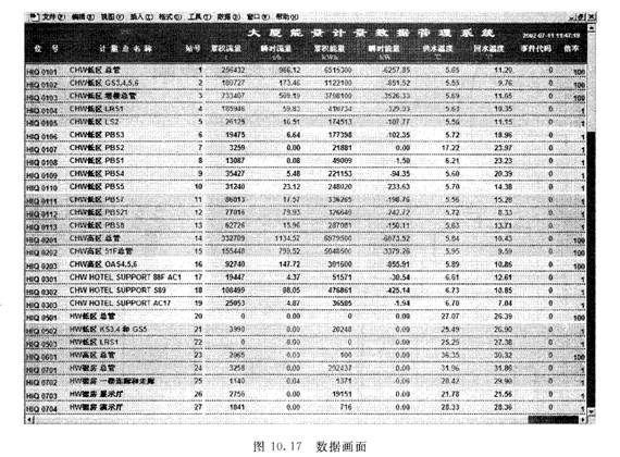 ④數據畫(huà)面。將各個(gè)檢測控制點(diǎn)的關(guān)鍵數據當前值依次列表,可以在一幅畫(huà)面中密集顯示有關(guān)數據和狀態(tài),借助滾動(dòng)條,可使表格向下延伸,從而可將整個(gè)系統的數據集中于一幅畫(huà)面。畫(huà)面中的數據數秒鐘更新一次,可使操作人員及時(shí)了解最新信息,如圖10.17所示。