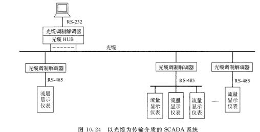 (1)系統的組成圖10.5所示為典型的由專(zhuān)用通信線(xiàn)纜組成的SCADA系統,因中的遠程終端裝置能送入過(guò)程變量流量、溫度、壓力等。AO口可送出4~20mA電流,控制調節閥, DO口可送出無(wú)源接點(diǎn)信號,控制電磁閥、泵等。遠程終端裝置與操作站之間用金屬屏蔽雙絞線(xiàn)連接,具有較強的抗干擾和抗雷擊性能。由于RS-485標準串口通信傳送的距離比RS-232遠,所以遠程終端裝置的通信口標準均為RS-485。由于計算機通信口采用的是RS-232標準,因此計算機同RS-485通信線(xiàn)之間須設置一臺RS-232/RS-485通信轉換器。