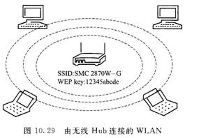 圖10.29所示為典型的由無(wú)線(xiàn)Hub連接的WLAN。